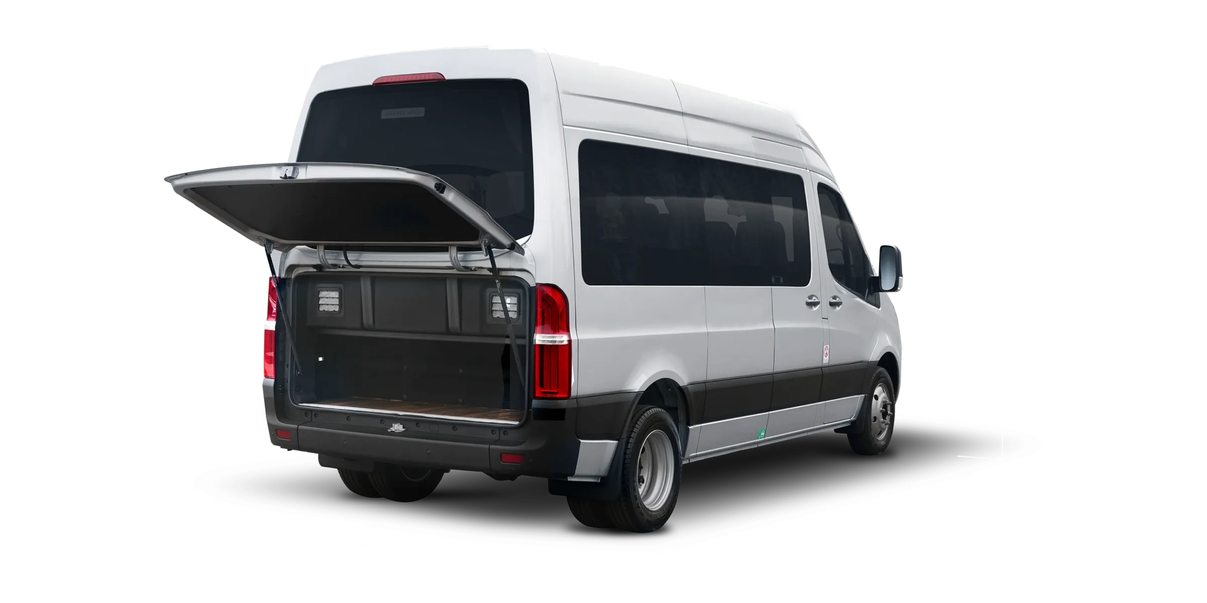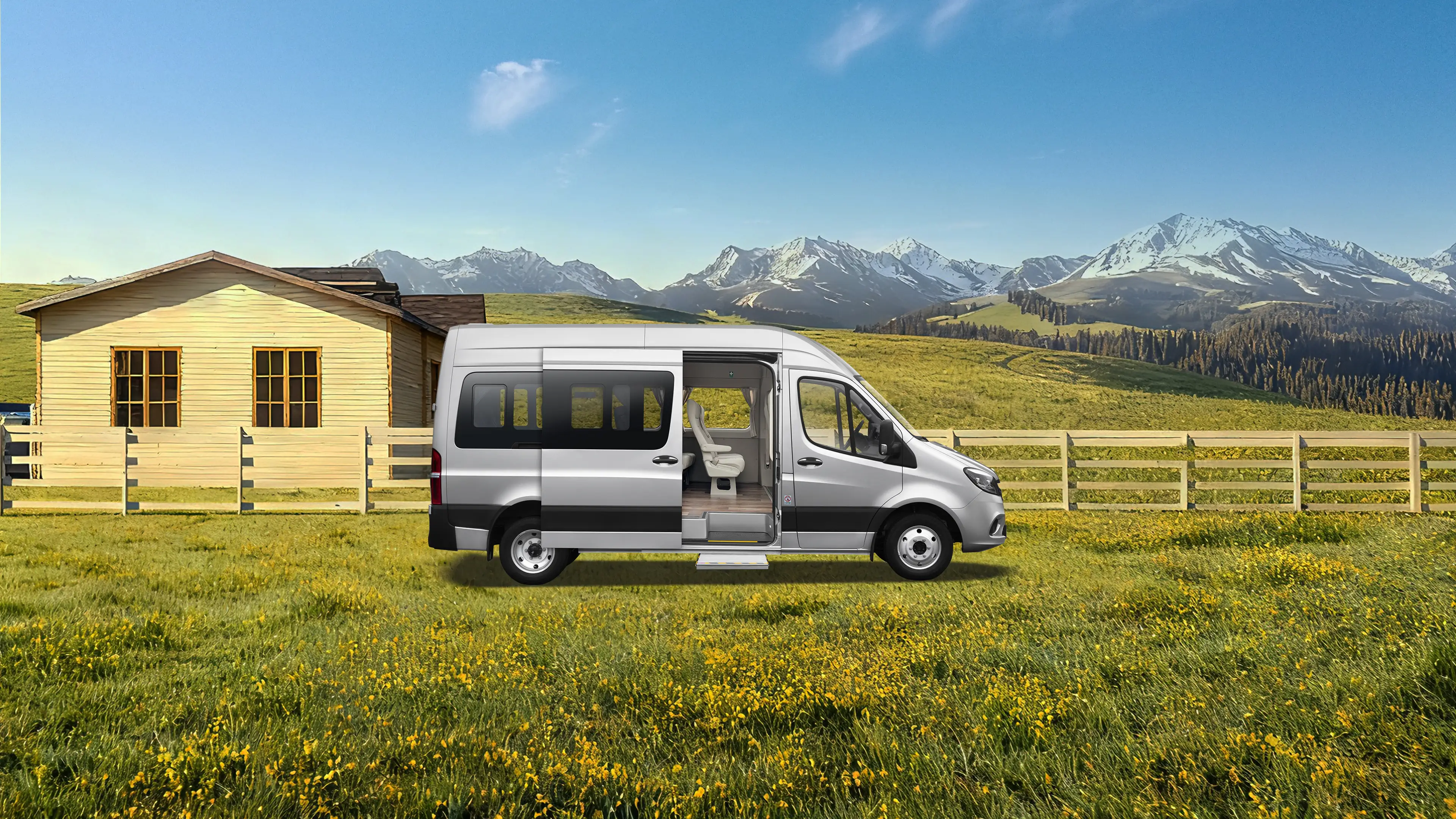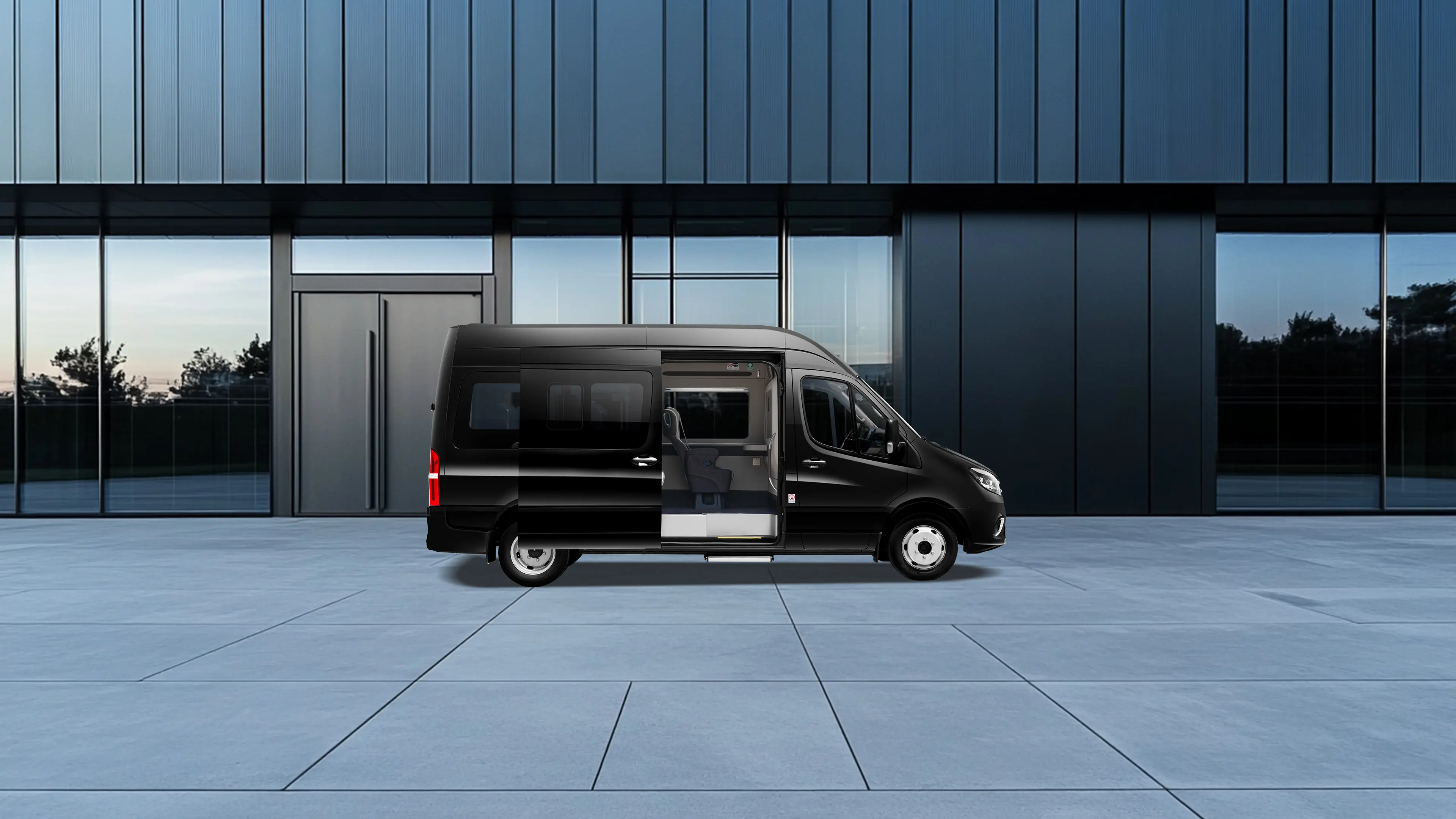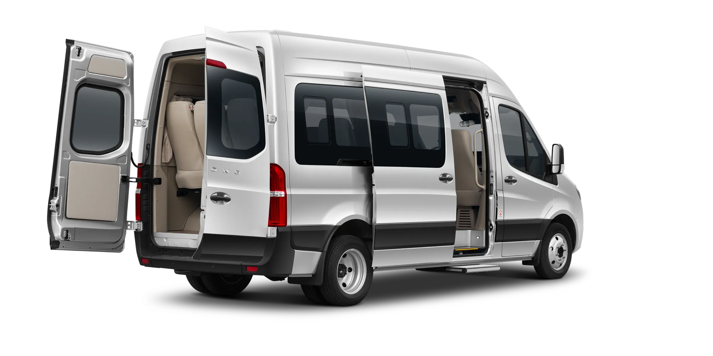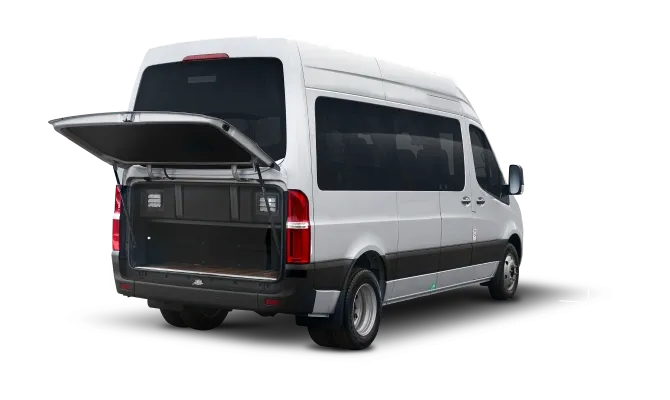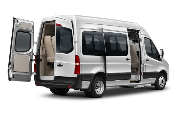 - Portas traseiras tipo barn doors + Porta de passageiros deslizante